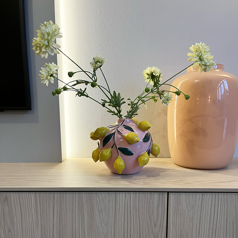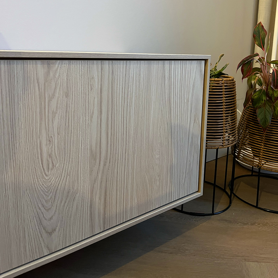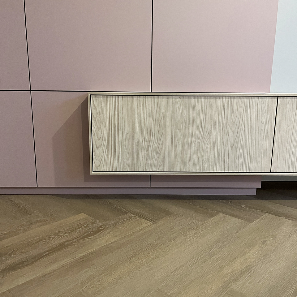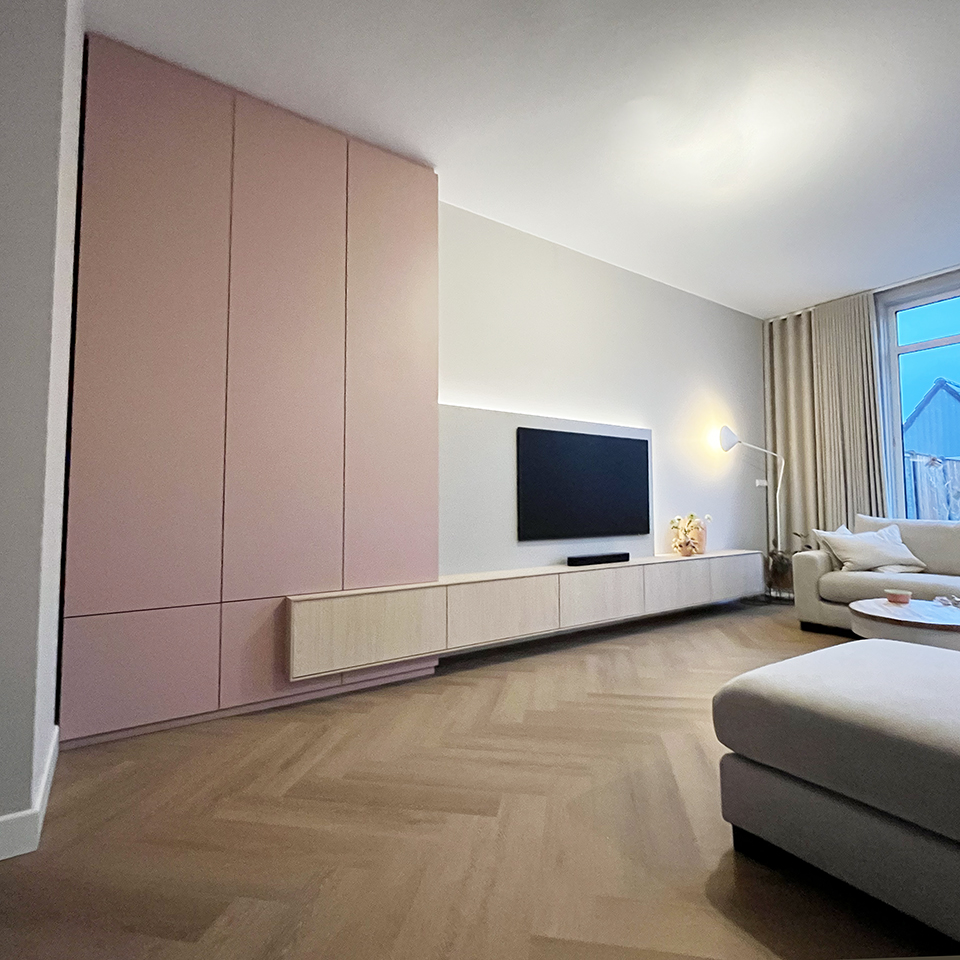 Serieuze afmetingen voor dit wandmeubel! Lengte bijna 6 meter, hoogte 3,5 meter. Voor het idee; de TV heeft een diameter van 65inch. Dit meubel geeft deze woonkamer meteen karakter. Groots maar niet opdringerig. Hoewel roze best een gewaagde kleur is past die perfect bij de rest van de woning. Icm de eiken structuur voor het horizontale deel en een lichtgrijs achter de TV is dit een prachtig plaatje geworden. De LED-verlichting maakt het geheel af.