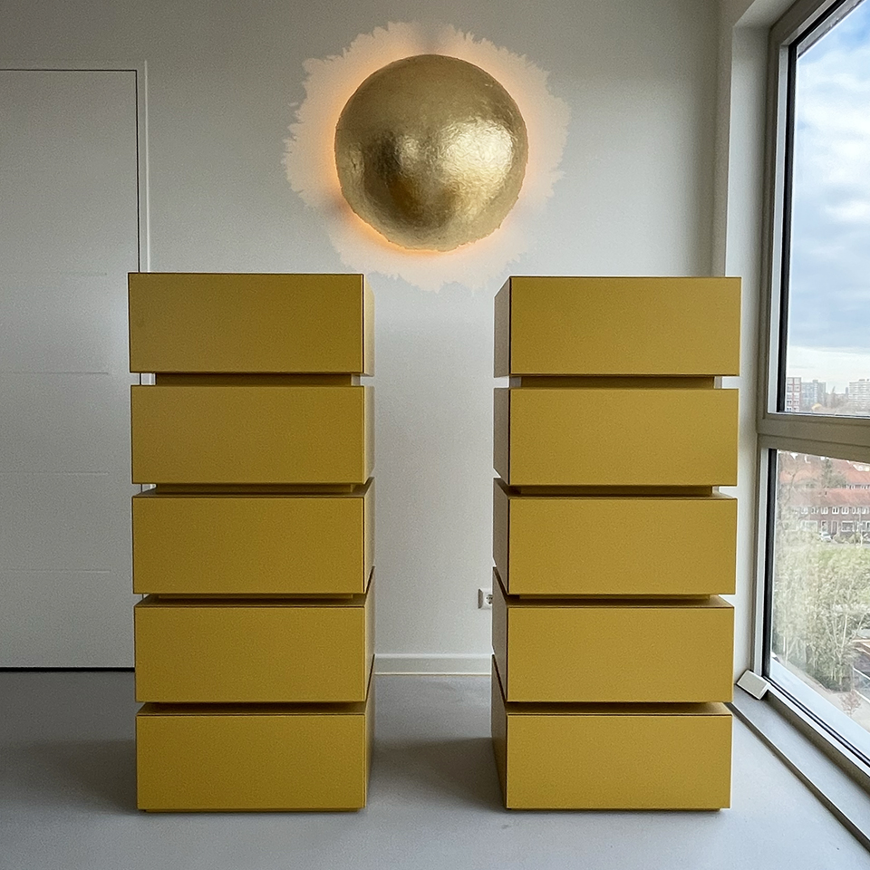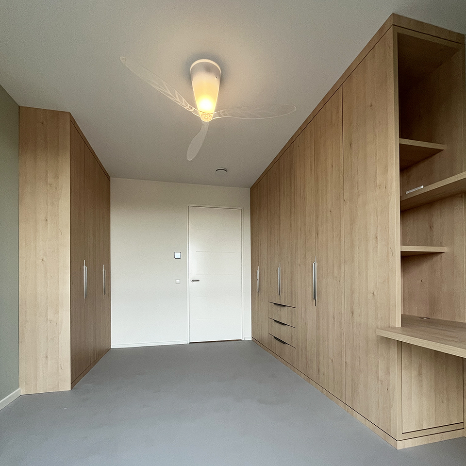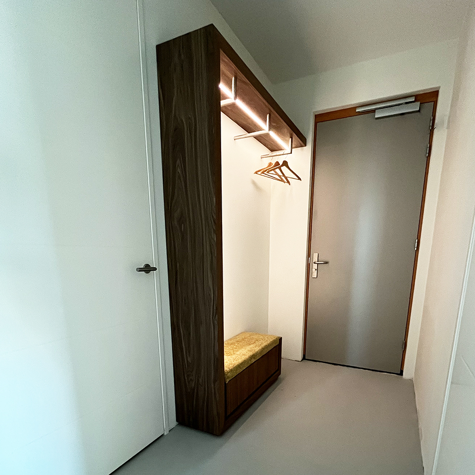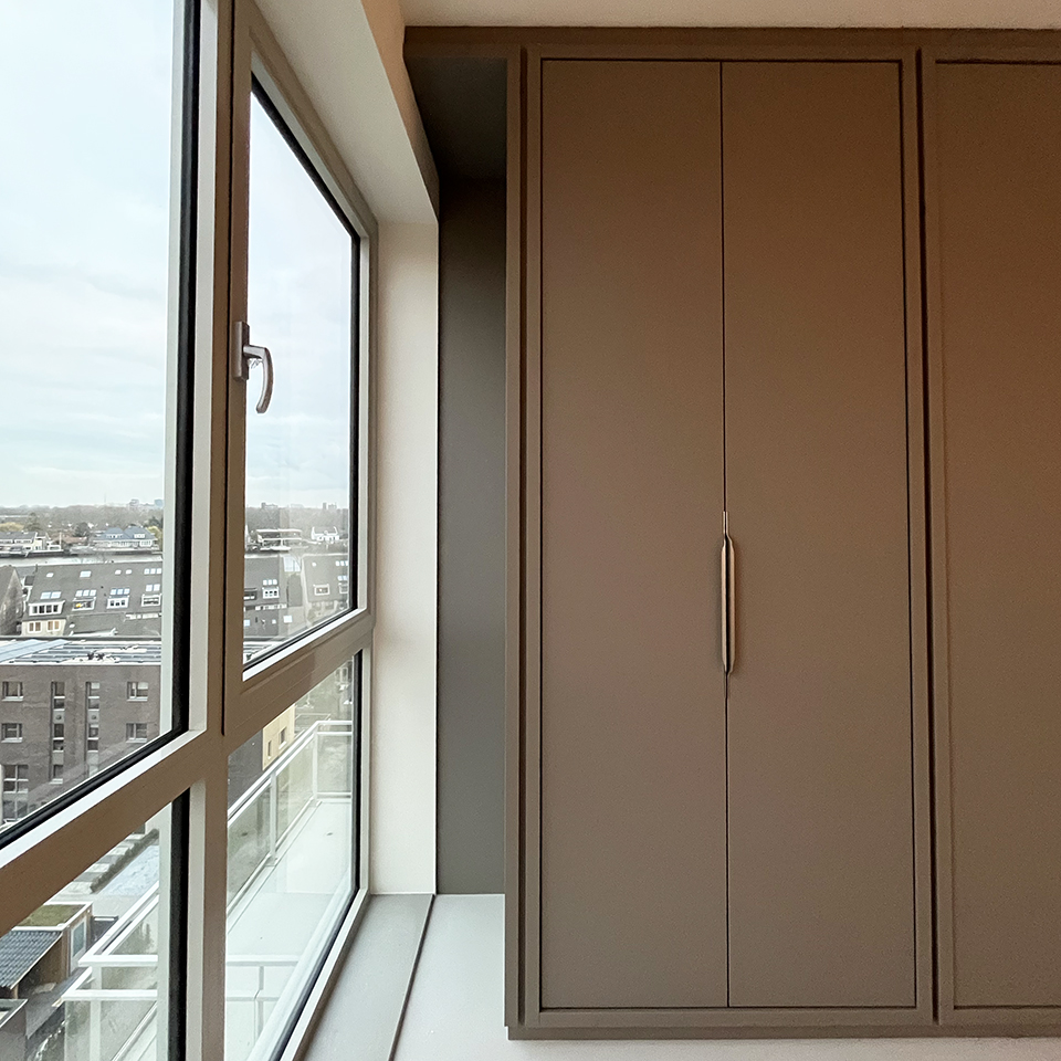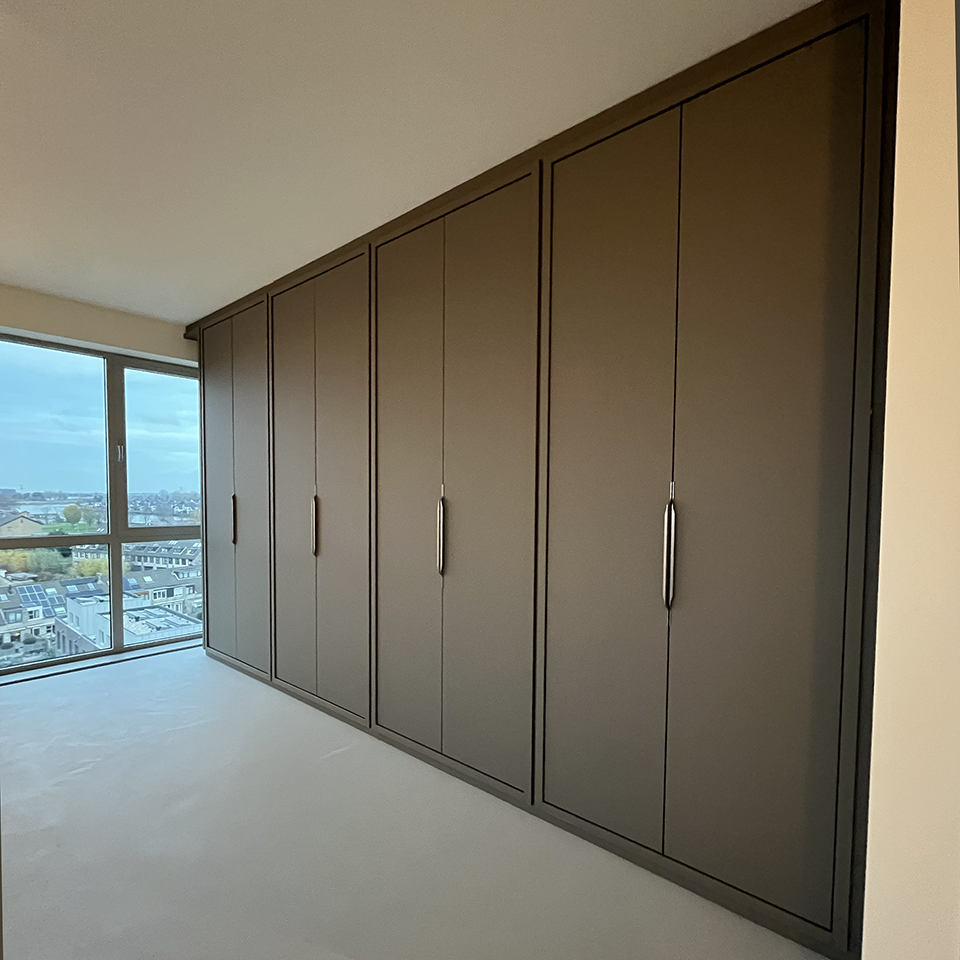 Voor deze woning in Capelle a/d IJssel hebben we alle maatwerk kasten geleverd: entree, slaapkamer, werkkamer, bijkeuken, technische ruimte en twee grote laden blokken in opvallende gele kleur. Een gemene deler is dat alle kasten ruimschoots zijn voorzien van LED-verlichting. Open je een deur dan wordt de binnenzijde van de kast royaal verlicht. In de slaapkamer hebben we een mooie warme bruin/grijze tint gebruikt. Elke kast heeft hier een kader gekregen met daaromheen een terugliggende plint. Ook de deuren liggen iets terug. Hierdoor krijg je een subtiele dieptewerking waardoor de kast veel sprekender wordt. De laden blokken zijn in een fraaie oker gele kleur gespoten. De laden zijn uitgevoerd in verstek voor een zo strak mogelijk eindresultaat. Het entree meubel is uitgevoerd in notenfineer en voorzien van een fraai gestoffeerde zitting. Ook hier uiteraard dimbare LED-verlichting.