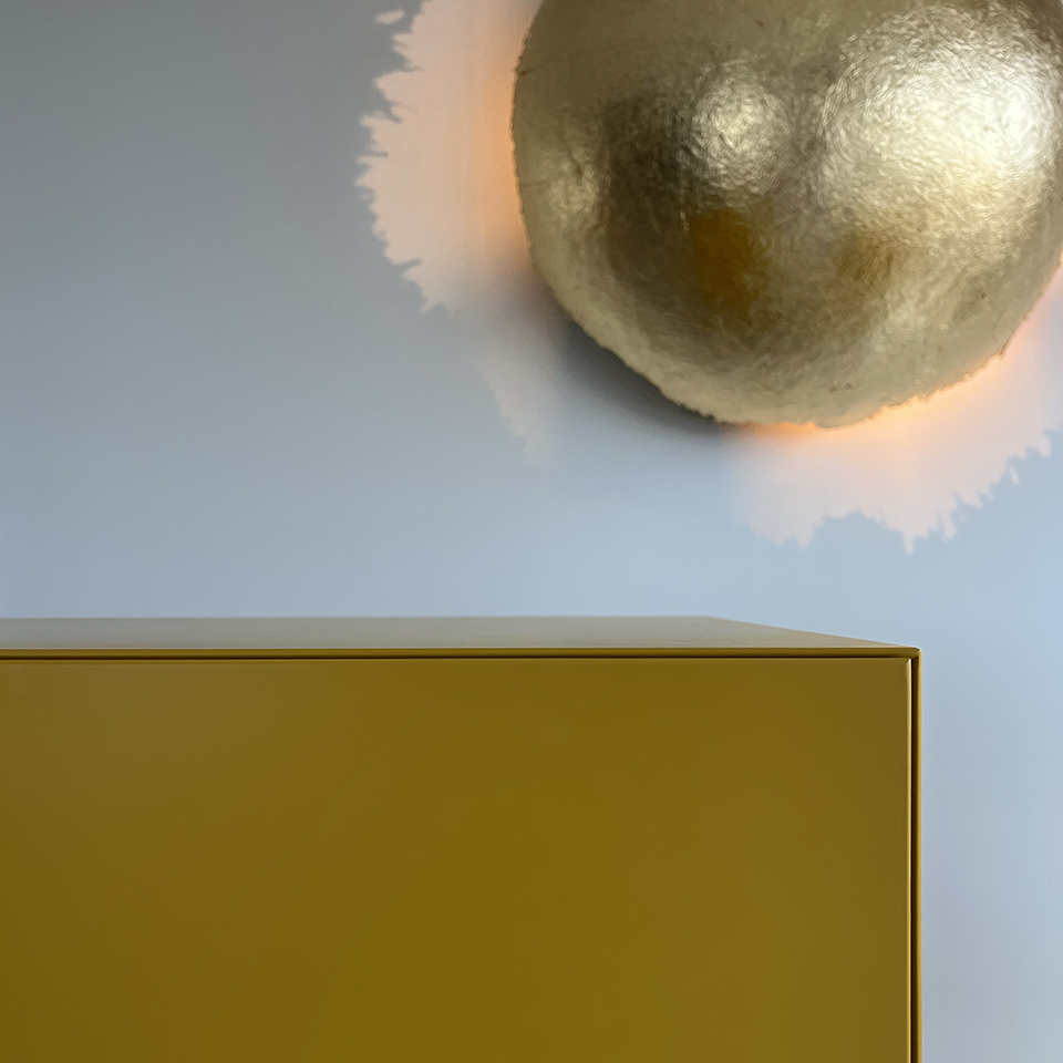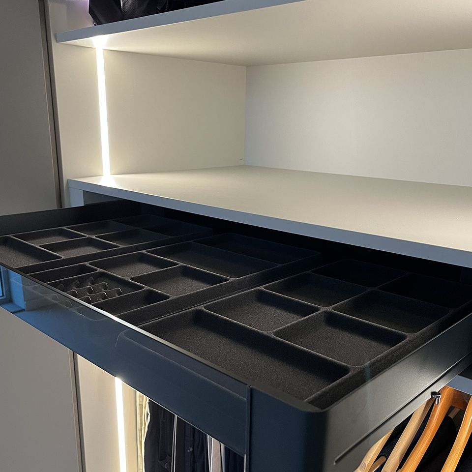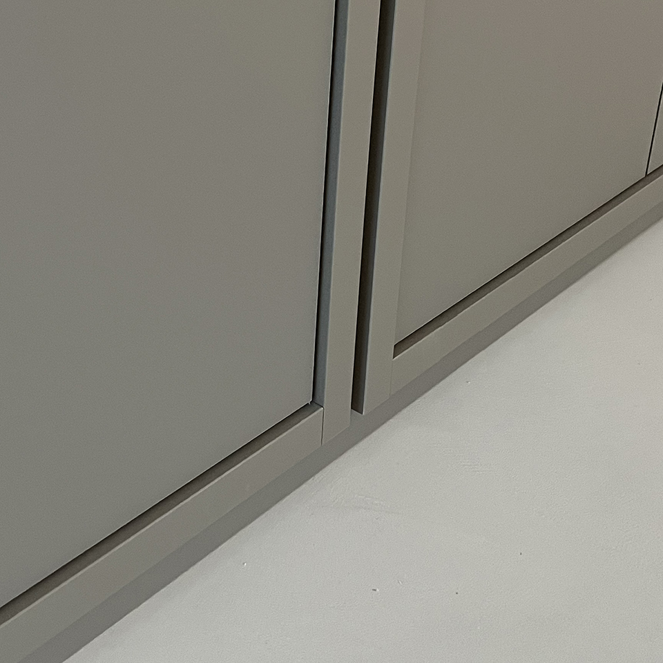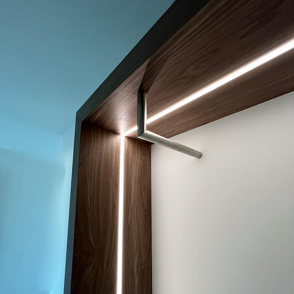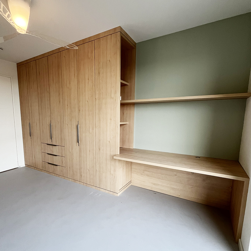 Voor deze woning in Capelle a/d IJssel hebben we alle maatwerk kasten geleverd: entree, slaapkamer, werkkamer, bijkeuken, technische ruimte en twee grote laden blokken in opvallende gele kleur. Een gemene deler is dat alle kasten ruimschoots zijn voorzien van LED-verlichting. Open je een deur dan wordt de binnenzijde van de kast royaal verlicht. In de slaapkamer hebben we een mooie warme bruin/grijze tint gebruikt. Elke kast heeft hier een kader gekregen met daaromheen een terugliggende plint. Ook de deuren liggen iets terug. Hierdoor krijg je een subtiele dieptewerking waardoor de kast veel sprekender wordt. De laden blokken zijn in een fraaie oker gele kleur gespoten. De laden zijn uitgevoerd in verstek voor een zo strak mogelijk eindresultaat. Het entree meubel is uitgevoerd in notenfineer en voorzien van een fraai gestoffeerde zitting. Ook hier uiteraard dimbare LED-verlichting.